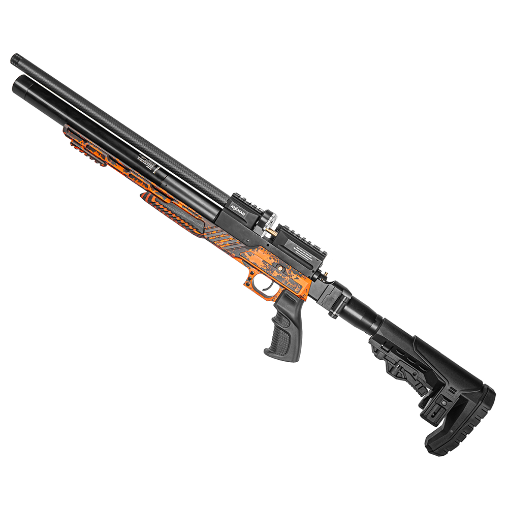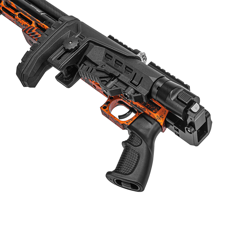 Ложе выполнено из алюминия с оранжевым анодированием — это не краска, а стойкое защитное покрытие. Приклад складной. Безопасность эксплуатации обеспечивает механический предохранитель.