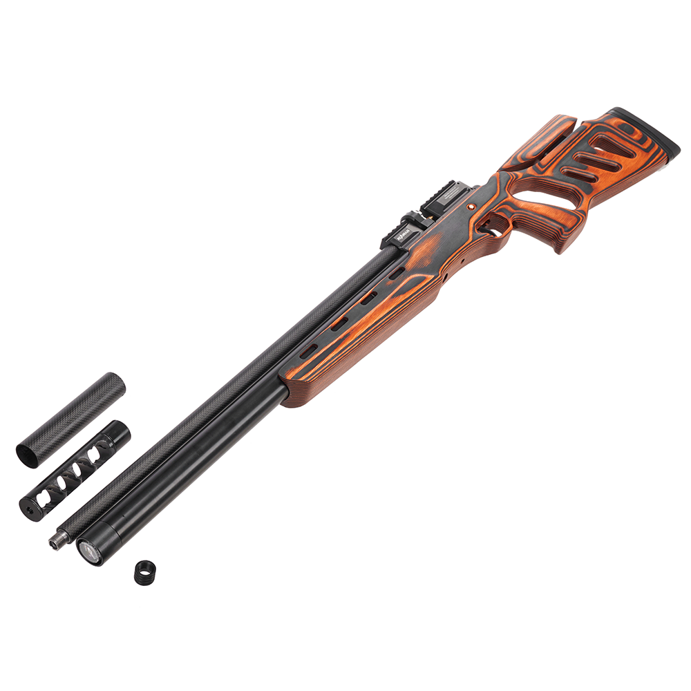 Ataman M20SD 642 L8 — высокоточная редукторная PCP-винтовка российского производства, рассчитанная на стрельбу полнотелыми пулями калибра 6,35 мм. Модель выполнена в эффектном ложе из оранжевого ламината и сочетает в себе надёжную механику, стабильную работу редуктора и фирменную точность Ataman.